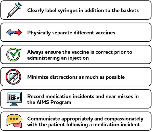 Clearly label syringes in addition to the baskets. Physically separate different vaccines. Always ensure the vaccine is correct prior to administering an injection. Minimize distractions as much as possible. Record medication incidents and near misses in the AIMS Program. Communicate appropriately and compassionately with the patient following a medication incident